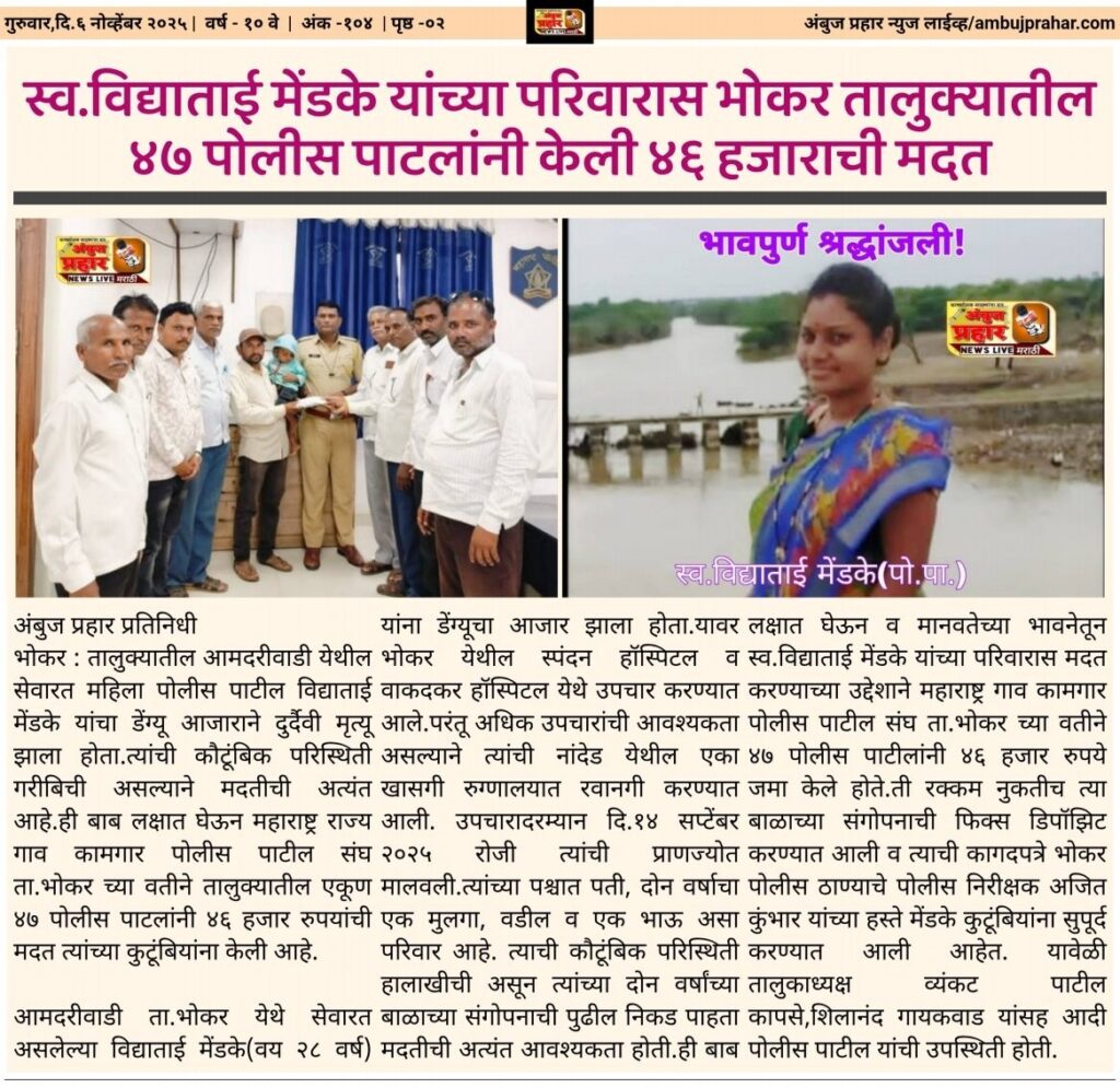 स्व.विद्याताई मेंडके यांच्या परिवारास भोकर तालुक्यातील ४७ पोलीस पाटलांनी केली ४६ हजाराची मदत