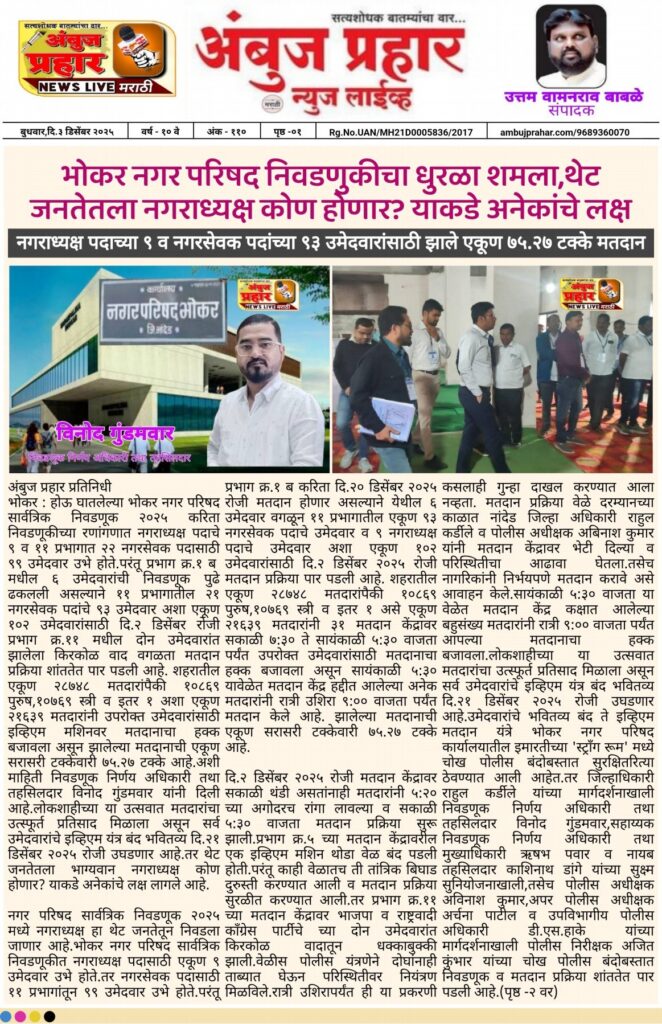 दि.२ डिसेंबर २०२५ रोजी मतदान केंद्रावर सकाळी थंडी असतांनाही मतदारांनी ५:२० च्या अगोदरच रांगा लावल्या व सकाळी ५:३० वाजता मतदान प्रक्रिया सुरू झाली.प्रभाग क्र.५ च्या मतदान केंद्रावरील एक इव्हिएम मशिन थोडा वेळ बंद पडली होती.परंतू काही वेळातच ती तांत्रिक बिघाड दुरुस्ती करण्यात आली व मतदान प्रक्रिया सुरळीत करण्यात आली.तर प्रभाग क्र.११ च्या मतदान केंद्रावर भाजपा व राष्ट्रवादी काँग्रेस पार्टीचे च्या दोन उमेदवारांत किरकोळ वादातून धक्काबुक्की झाली.वेळीस पोलीस यंत्रणेने दोघांनाही ताब्यात घेऊन परिस्थितीवर नियंत्रण मिळविले.रात्री उशिरापर्यंत ही या प्रकरणी कसलाही गुन्हा दाखल करण्यात आला नव्हता. मतदान प्रक्रिया वेळे दरम्यानच्या काळात नांदेड जिल्हा अधिकारी राहुल कर्डीले व पोलीस अधीक्षक अबिनाश कुमार यांनी मतदान केंद्रावर भेटी दिल्या व परिस्थितीचा आढावा घेतला.तसेच नागरिकांनी निर्भयपणे मतदान करावे असे आवाहन केले. सायंकाळी ५:३० वाजता या वेळेत मतदान केंद्र कक्षात आलेल्या बहुसंख्य मतदारांनी रात्री ९:०० वाजता पर्यंत आपल्या मतदानाचा हक्क बजावला.लोकशाहीच्या या उत्सवात मतदारांचा उत्स्फूर्त प्रतिसाद मिळाला असून सर्व उमेदवारांचे इव्हिएम यंत्र बंद भवितव्य दि.२१ डिसेंबर २०२५ रोजी उघडणार आहे.उमेदवारांचे भवितव्य बंद ते इव्हिएम मतदान यंत्रे भोकर नगर परिषद कार्यालयातील इमारतीच्या ‘स्ट्रॉंग रूम’ मध्ये चोख पोलीस बंदोबस्तात सुरक्षितरित्या ठेवण्यात आली आहेत.तर जिल्हाधिकारी राहुल कर्डीले यांच्या मार्गदर्शनाखाली निवडणूक निर्णय अधिकारी तथा तहसिलदार विनोद गुंडमवार,सहाय्यक निवडणूक निर्णय अधिकारी तथा मुख्याधिकारी ऋषभ पवार व नायब तहसिलदार काशिनाथ डांगे यांच्या सुक्ष्म सुनियोजनाखाली,तसेच पोलीस अधीक्षक अविनाश कुमार, अपर पोलीस अधीक्षक अर्चना पाटील व उपविभागीय पोलीस अधिकारी डी.एस.हाके यांच्या मार्गदर्शनाखाली पोलीस निरीक्षक अजित कुंभार यांच्या नियोजनबद्ध चोख पोलीस बंदोबस्तात निवडणूक व मतदान प्रक्रिया शांततेत पार पडली आहे.