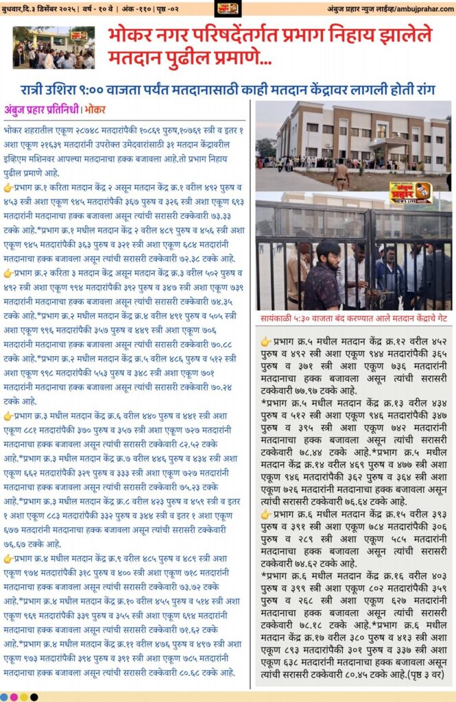 भोकर नगर परिषदेंतर्गत प्रभाग निहाय झालेले मतदान पुढील प्रमाणे…