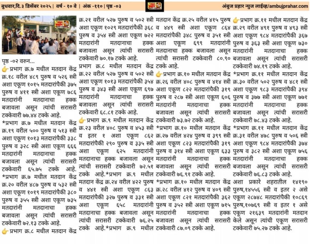 *प्रभाग क्र.६ करिता ३ मतदान केंद्र असून त्यांचे क्र.१५,१६ व १७ असे आहेत.मतदान केंद्र क्र.१५ वरील ३९३ पुरुष व ३९१ स्त्री अशा एकूण ७८४ मतदारांपैकी ३०६ पुरुष व २८९ स्त्री अशा एकूण ५८५ मतदारांनी मतदानाचा हक्क बजावला असून त्यांची सरासरी टक्केवारी ७४.६२ टक्के आहे.मतदान केंद्र क्र.१६ वरील ४०३ पुरुष व ३९९ स्त्री अशा एकूण ८०२ मतदारांपैकी ३५९ पुरुष व २६८ स्त्री अशा एकूण ६२७ मतदारांनी मतदानाचा हक्क बजावला असून त्यांची सरासरी टक्केवारी ७८.१८ टक्के आहे.मतदान केंद्र क्र.१७ वरील ३८० पुरुष व ४१३ स्त्री अशा एकूण ८९३ मतदारांपैकी ३०१ पुरुष व ३३७ स्त्री अशा एकूण ६३८ मतदारांनी मतदानाचा हक्क बजावला असून त्यांची सरासरी टक्केवारी ८०.४५ टक्के आहे. *प्रभाग क्रमांक ७ करिता ३ मतदान केंद्र असून त्यांचे क्र.१८,१९ व २० असे आहेत.मतदान केंद्र क्र.१८ वरील ४८९ पुरुष व ५२६ स्त्री अशा एकूण १०१५ मतदारांपैकी ३७५ पुरुष व ४११ स्त्री अशा एकूण ७८६ मतदारांनी मतदानाचा हक्क बजावला असून त्यांची सरासरी टक्केवारी ७७.४४ टक्के आहे.मतदान केंद्र क्र.१९ वरील ५०० पुरुष व ५१३ स्त्री अशा एकूण १०१३ मतदारांपैकी ३३८ पुरुष व ३२८ स्त्री अशा एकूण ६६६ मतदारांनी मतदानाचा हक्क बजावला असून त्यांची सरासरी टक्केवारी ६५.७५ टक्के आहे.मतदान केंद्र क्र.२० वरील ४८७ पुरुष व ५३२ स्त्री अशा एकूण १०१९ मतदारांपैकी ३८० पुरुष व ३५५ स्त्री अशा एकूण ७३५ मतदारांनी मतदानाचा हक्क बजावला असून त्यांची सरासरी टक्केवारी ७२.१३ टक्के आहे.