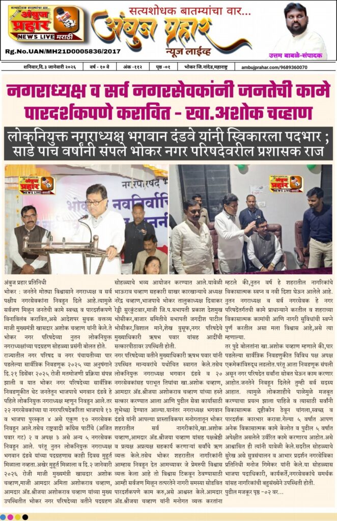 लोकनियुक्त नगराध्यक्ष भगवान दंडवे यांनी स्विकारला पदभार ; साडे पाच वर्षांनी संपले भोकर नगर परिषदेवरील प्रशासक राज