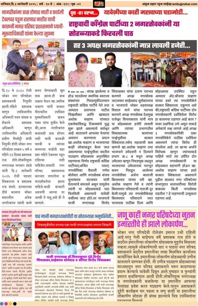 राज्यातील नगर परिषद व नगर पंचायतीच्या पार पडलेल्या सार्वत्रिक निवडणूक २०२५ च्या अनुषंगाने दि.२१ डिसेंबर २०२५ रोजी मतमोजणी प्रक्रिया संपन्न झाली व यात भोकर नगर परिषदेच्या सार्वत्रिक निवडणूकीत थेट जनतेतून भाजपाचे भगवान दंडवे हे पहिले लोकनियुक्त नगराध्यक्ष म्हणून निवडून आले.तर २२ नगरसेवकांच्या या नगरपरिषदेकरिता भाजपाचे १३ व भाजपा पुरस्कृत ४ असे एकूण १७ नगरसेवक निवडून आले.तसेच राष्ट्रवादी काँग्रेस पार्टीचे (अजित पवार गट) २ व अपक्ष ३ असे अन्य ५ नगरसेवक निवडून आले. परंतू नुतन लोकनियुक्त नगराध्यक्ष भगवान दंडवे यांच्या पदग्रहणास काही दिवस मुहूर्त मिळाला नव्हता.अखेर मुहूर्त मिळाला व दि.२ जानेवारी २०२६ रोजी माजी मुख्यमंत्री खासदार अशोक चव्हाण,माजी आमदार अमिता अशोकराव चव्हाण,आमदार ॲड.श्रीजया अशोकराव चव्हाण यांच्या मुख्य उपस्थितीत भोकर नगर परिषदेच्या वतीने पदग्रहण सोहळ्याचे भव्य आयोजन करण्यात आले.