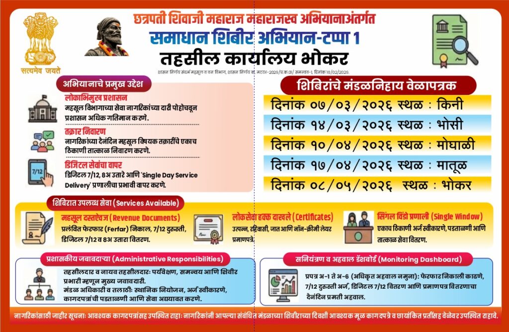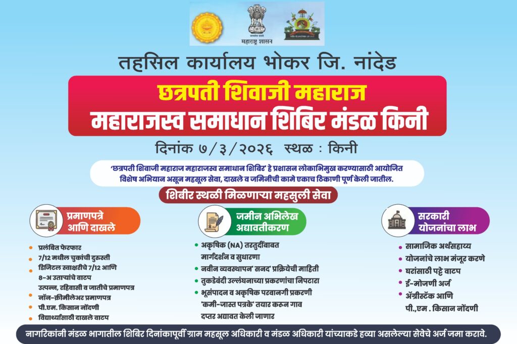 दि.७ मार्च २०२६ ते दि.८ मे २०२६ या कालावधीत भोकर तालुक्यातील ५ मंडळ स्तरावर शिबिरांचे आयोजन करण्यात आले आहे.यातील मंडळ निहाय शिबिराचे आयोजन पुढील प्रमाणे आहे.दि.७ मार्च २०२६ रोजी किनी, दि.१४ मार्च २०२६ रोजी भोसी, दि.१० एप्रिल २०२६ रोजी मोघाळी,दि.१७ एप्रिल २०२६ रोजी मातूळ व दि.८ मे २०२६ रोजी भोकर येथे आयोजन करण्यात आले आहे.या शिबिरात नागरिकांच्या दैनंदिन महसूल विषयक तक्रारी व प्रलंबित कामांचा तत्काळ निपटारा केला जाणार आहे.