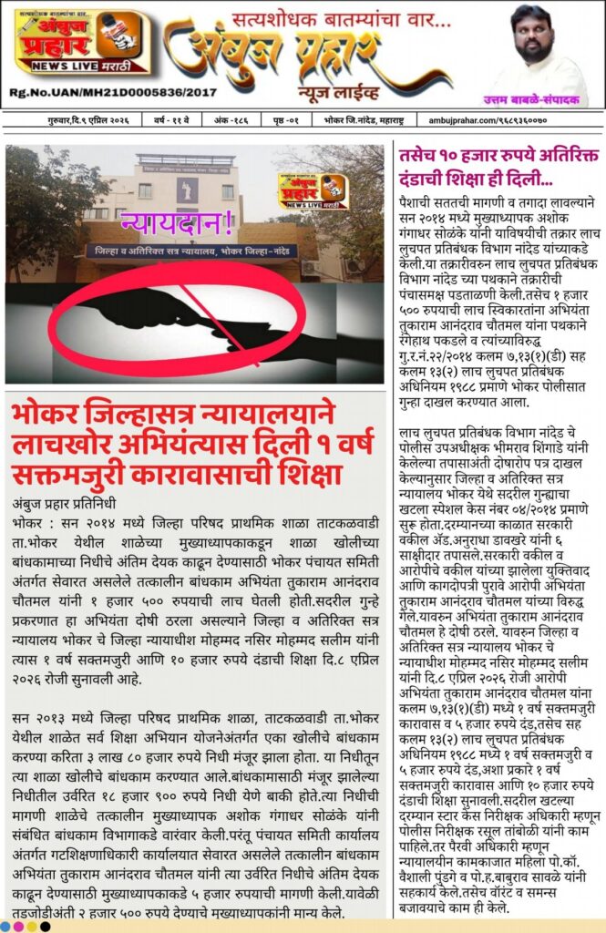 भोकर : सन २०१४ मध्ये जिल्हा परिषद प्राथमिक शाळा ताटकळवाडी ता.भोकर येथील शाळेच्या मुख्याध्यापकाकडून शाळा खोलीच्या बांधकामाच्या निधीचे अंतिम देयक काढून देण्यासाठी भोकर पंचायत समिती अंतर्गत सेवारत असलेले तत्कालीन बांधकाम अभियंता तुकाराम आनंदराव चौतमल यांनी १ हजार ५०० रुपयाची लाच घेतली होती.सदरील गुन्हे प्रकरणात हा अभियंता दोषी ठरला असल्याने जिल्हा व अतिरिक्त सत्र न्यायालय भोकर चे जिल्हा न्यायाधीश मोहम्मद नसिर मोहम्मद सलीम यांनी त्यास १ वर्ष सक्तमजुरी आणि १० हजार रुपये दंडाची शिक्षा दि.८ एप्रिल २०२६ रोजी सुनावली आहे.