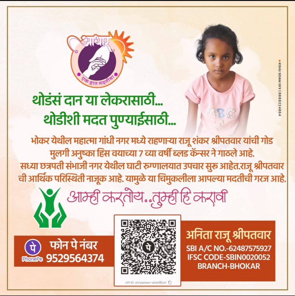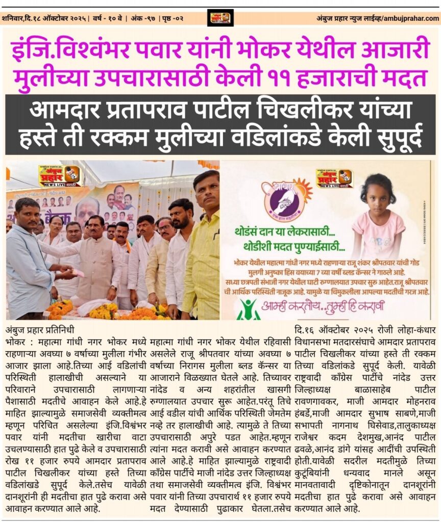 महात्मा गांधी नगर भोकर येथील रहिवासी असलेले राजू श्रीपतवार यांच्या अवघ्या ७ वर्षाच्या निरागस मुलीला ब्लड कॅन्सर या आजाराने विळख्यात घेतले आहे.तिच्यावर नांदेड व अन्य शहरांतील खासगी रुग्णालयात उपचार सुरू आहेत.परंतू तिचे आई वडील यांची आर्थिक परिस्थिती जेमतेम नव्हे तर हालाखीची आहे.त्यामुळे ते तिच्या उपचारासाठी अपुरे पडत आहेत.म्हणून त्यांना मदत करावी असे आवाहन करण्यात आले आहे.हे माहित झाल्यामुळे राष्ट्रवादी काँग्रेस पार्टीचे माजी नांदेड उत्तर जिल्हाध्यक्ष तथा समाजसेवी व्यक्तीमत्व इंजि.विश्वंभर पवार यांनी तिच्या उपचारार्थ ११ हजार रुपये मदत देण्यासाठी पुढाकार घेतला.तसेच दि.१६ ऑक्टोबर २०२५ रोजी लोहा-कंधार विधानसभा मतदारसंघाचे आमदार प्रतापराव पाटील चिखलीकर यांच्या हस्ते ती रक्कम तिच्या वडिलांकडे सुपूर्द केली.यावेळी राष्ट्रवादी काँग्रेस पार्टीचे नांदेड उत्तर जिल्हाध्यक्ष बाळासाहेब पाटील रावणगावकर,माजी आमदार मोहनराव हंबर्डे,माजी आमदार सुभाष साबणे, माजी सभापती नागनाथ घिसेवाड,तालुकाध्यक्ष राजेश्वर कदम देशमुख,आनंद पाटील ढवळे,आनंद डांगे यांसह आदींची उपस्थिती होती.यावेळी सदरील मदतीमुळे तिच्या कुटूंबियांनी धन्यवाद मानले असून मानवतावादी दृष्टिकोनातून दानशूरांनी मदतीचा हात पुढे करावा असे आवाहन करण्यात आले आहे.